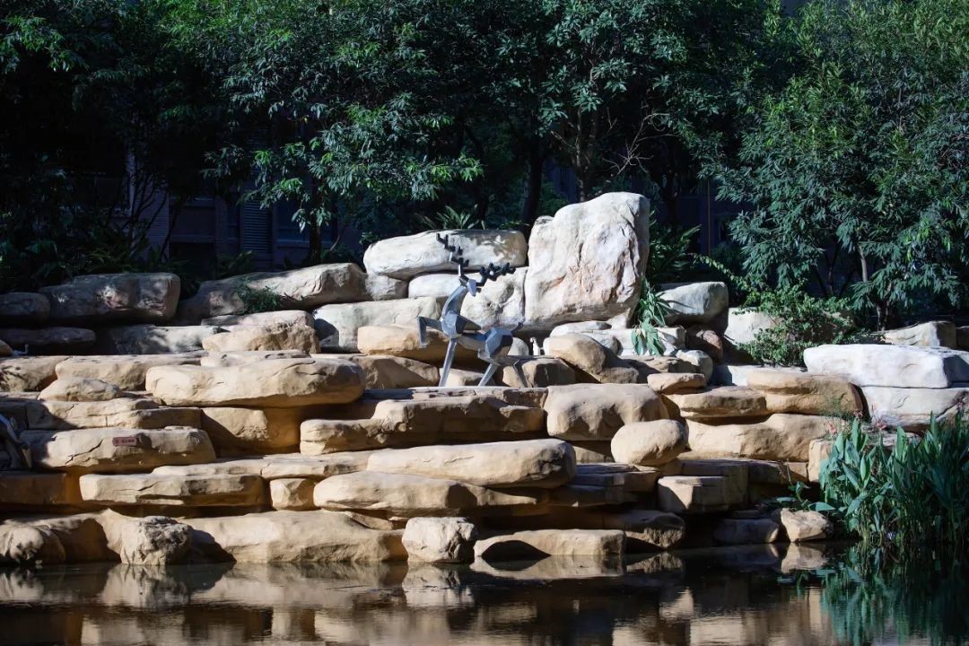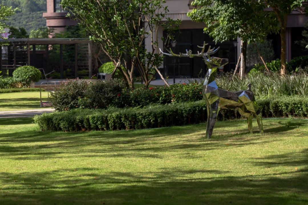 項(xiàng)目尊重城市肌理的同時(shí),通過(guò)采集自然的靈魂?duì)I造出獨(dú)特的生態(tài)脈絡(luò)。采用光際穿梭的直線、云團(tuán)投影的弧形、河流流動(dòng)的曲線、梯田植被的層次以及栩栩如生的動(dòng)物造型作為景觀建造布局的設(shè)計(jì)元素,形態(tài)各異的長(zhǎng)角鹿造型作為主要元素布置在牧云溪谷的山水漫野間,猶如畫龍點(diǎn)睛,為空靈的生態(tài)園林增添勃勃生機(jī)。