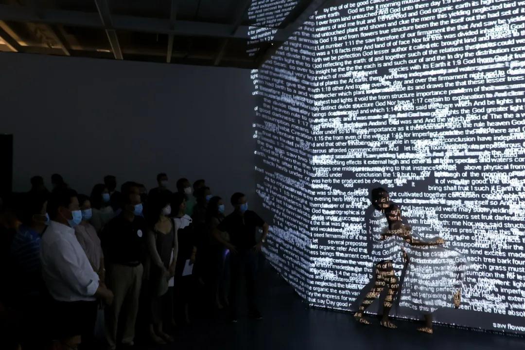此次開幕式還在展廳中央與社區(qū)空間中為現(xiàn)場(chǎng)嘉賓呈現(xiàn)了由北京現(xiàn)代舞團(tuán)帶來的沉浸式現(xiàn)代舞表演,舞者的表演與展廳中的新媒體藝術(shù)作品和裝置藝術(shù)作品融為一體,讓觀眾身臨其境,改變過往單一視覺化認(rèn)知,以身體、感知、意識(shí)等多維感官的角度來理解藝術(shù)。