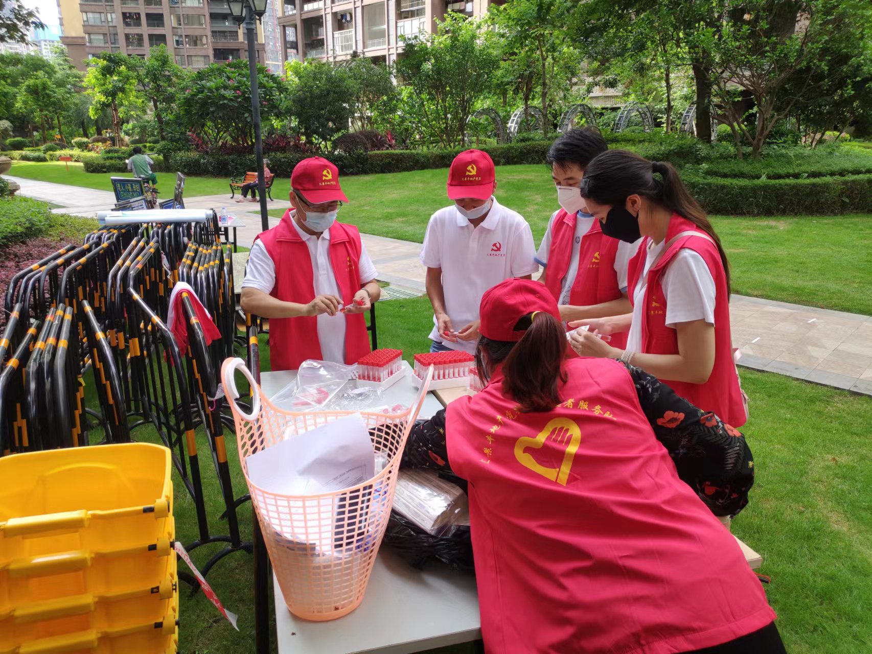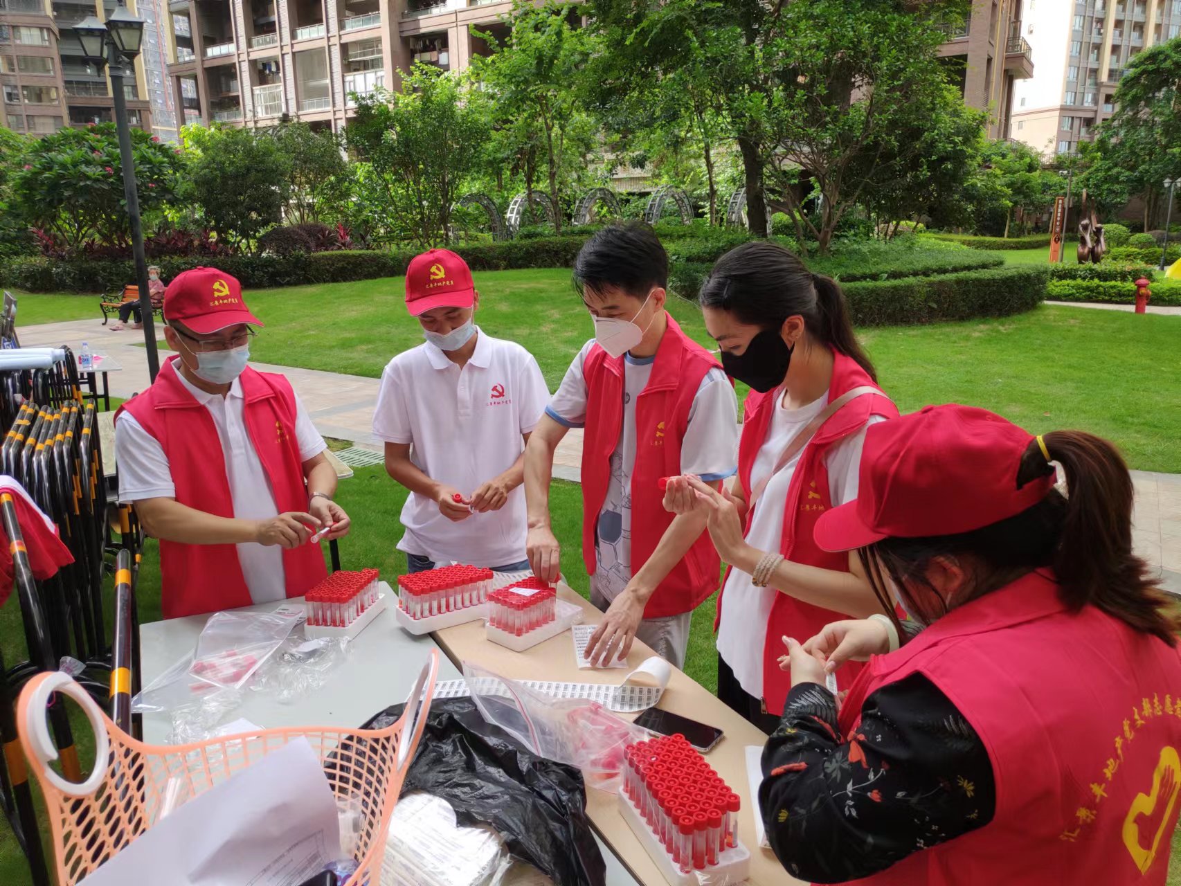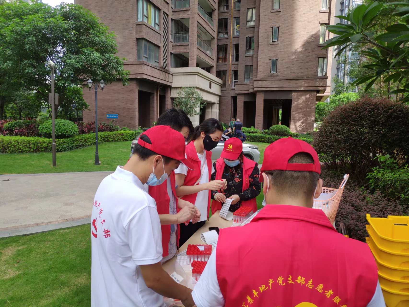 7月19日,在匯景豐地產(chǎn)黨支部張書記的帶領(lǐng)下,匯景豐地產(chǎn)黨支部黨員也參與新圩鎮(zhèn)牧云溪谷疫情防控工作。黨員志愿者協(xié)助塘嚇社區(qū)居委會(huì)為牧云溪谷二期住戶開展全面核酸檢測(cè)工作。